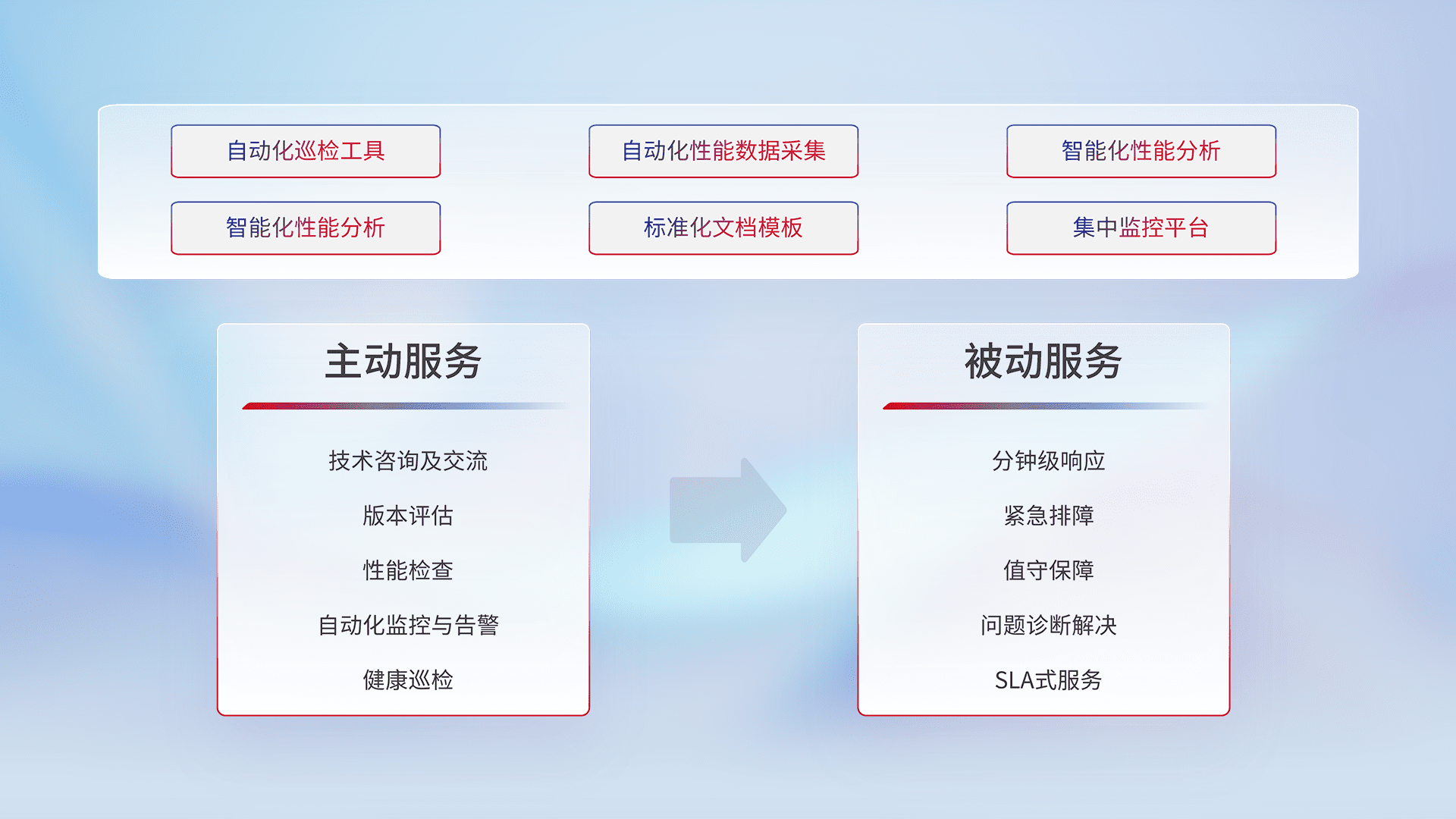 智能化工具和标准化文档,,,保障服务质量,,,提供主动服务(包含技术咨询、、、版本评估、、、、性能检查、、自动化监控与告警、、健康巡检)和被动服务包含(分钟级响应、、、紧急排障、、值守保障、、、问题诊断解决、、SLA服务)。。。。