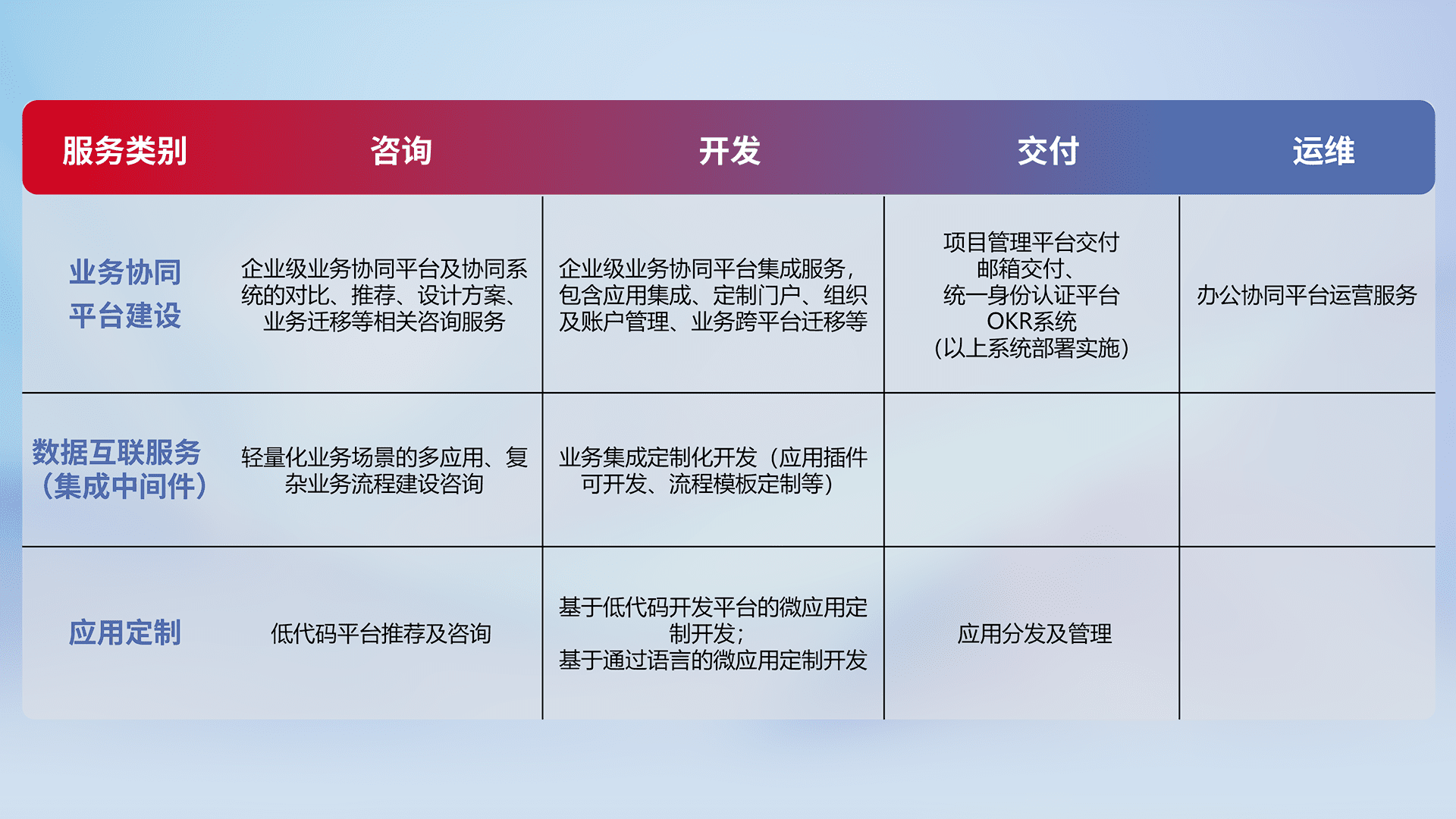 针对钉钉、、、企微、、、、IDaas等平台级产品提供产品的规划、、、、方案、、、、交付、、定制化开发等服务,,,,实现如统一协同办公、、、智能客户服务、、、、混合会议管理、、智能数据查询、、等业务场景,,,实现数字化转型。。